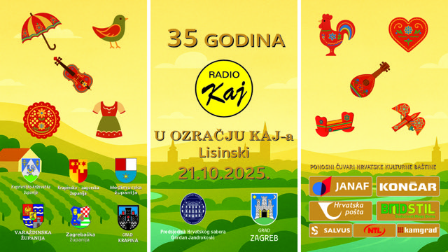 Svečanim koncertom “U ozračju Kaja”, u prepunoj Koncertnoj dvorani Vatroslava Lisinskog u Zagrebu, Radio Kaj je, 21. listopada 2025. godine, proslavio 35 godina postojanja – tri i pol desetljeća predanog rada, povezivanja zajednica i očuvanja kajkavske glazbe i identiteta. Više od dva sata glazbenog slavlja, emocija i zajedništva obilježilo je ovu nezaboravnu večer. Na pozornici se izmijenilo više od 30 izvođača – od glazbenih legendi kajkavske scene do mladih snaga koje nastavljaju tradiciju. Uz pratnju Orkestra Radija Kaj, izvedene su najljepše popevke kajkavskog podneblja koje je publika u dvorani s oduševljenjem prihvatila i otpjevala. Publiku su oduševili nastupi Vanne, Jacquesa Houdeka, Mie Dimšić, Matije Cveka, Željka Krušlina Kruške, Zdenke Kovačiček, Đanija Stipaničeva, Martina Kosovca, Marka Škugora, Filipa Hozjaka, Adama Končića, Tanje Mršić, Mirka Švende Žige, Željka Sesvečana, Stjepana Jeršeka Štefa, Ivana Benca, Gordane Ivanjek Tušek, Ive i Elle Ranogajec Inkret, Karle i Dina Miklaužića te glazbenih skupina: Kavaliri, Kirjales, Đurđevčice, Singrlice, Kajda, Fiola, Queentete, Figurin, Brv i Kmeti. Svi oni koji su godinama stvarali uz Radio Kaj i ostavili neizbrisiv trag u glazbenom životu Hrvatske. Koncert je otvoren obraćanjima visokih uzvanika, koji su istaknuli neprocjenjivu ulogu Radija Kaj u očuvanju jezika, kulture i identiteta sjeverozapadne Hrvatske. Njihove riječi zahvale, priznanja i podrške, snažna su potvrda važnosti Radija Kaj kao kulturne i medijske institucije koja već tri i pol desetljeća čuva i promiče kajkavski jezik, glazbu, baštinu i osjećaj zajedništva.