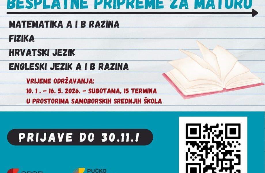SAMOBOR – Besplatne pripreme za državnu maturu i ove školske godine organizira Grad Samobor u suradnji s Pučkim otvorenim učilištem. Besplatne pripreme iz engleskog jezika A i B razina, matematike A i B razina, hrvatskog jezika i fizike osigurane su za maturante koji polaze neku od samoborskih srednjih škola ili žive u Samoboru. Broj mjesta je ograničen te je potrebna prijava do 30. studenog putem obrasca koji se nalazi na službenoj gradskoj stranici. Pripreme će se provoditi subotama u prostorima samoborskih srednjih škola od 10. siječnja do 16. svibnja 2026. godine.