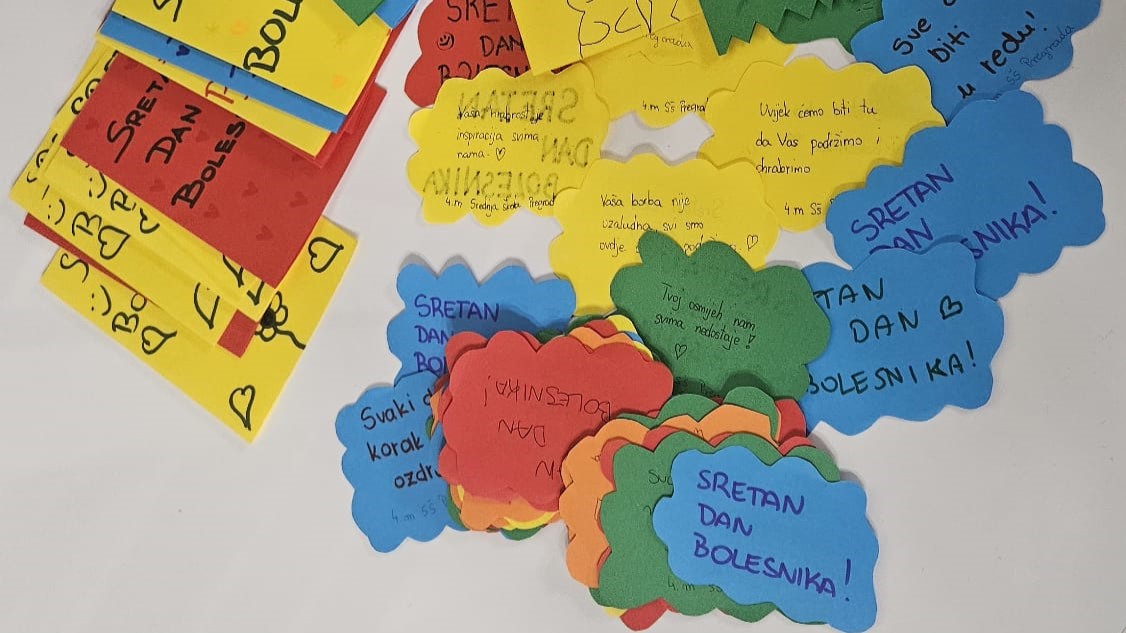 Učenici su izradili čestitke i napisali poruke hrabrosti bolesnicima, s ciljem pružanja emocionalne podrške, poticanja na ustrajnost i snagu u suočavanju s bolešću. Čestitke su bile personalizirane i prilagođene svakom bolesniku, čime su učenici pokazali visok stupanj empatije i profesionalnosti te su kroz ovu aktivnost demonstrirali ključne kompetencije neophodne za buduće medicinske sestre i tehničare, uključujući komunikacijske vještine, empatiju, timski rad i etičnost.