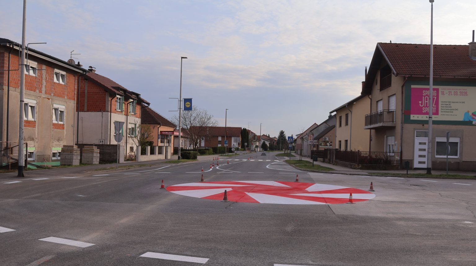Prema projektu, na postojećim prometnim površinama uspostavljeno je privremeno montažno kružno raskrižje vanjskog radijusa 11 metara, koje je izvedeno iscrtavanjem prometnih linija i zaprečnih površina u bijeloj i crvenoj boji na postojećem asfaltu, dok su unutar kružnog raskrižja i njegovih prilaza postavljene privremene razdvajajuće ograde i odgovarajuća prometna signalizacija.